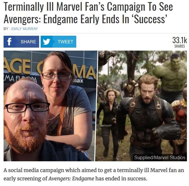相信對於許多漫威迷來說,可以在這一生當中,看到所有的漫威電影,絕對就是沒有遺憾了!不過在澳洲有一位罹患罕病的33歲男子亞歷山大 (Alexander) ,他是一位漫威迷,但是因為身體狀況整個越來越不好,他非常擔心自己撐不到即將在4月上映的《復仇者聯盟4:終局之戰》 (Avengers:Endgame) ,便上網在論壇上發文來抒發難過的情緒,還祈禱說「如果可以提早看到電影就好了」。引起網友瘋狂分享,沒想到迪士尼公司既然真的聯絡到他,並且答應讓他當全球第一位觀賞《復仇者聯盟4》的人!讓許多人都替他感到開心。