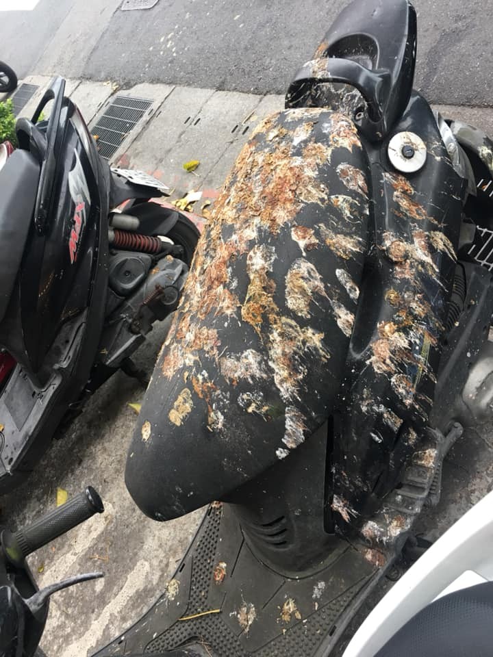 不曉得這些鳥兒是不是跟這台車有什麼很深的「恩怨」,除了椅墊充滿了糞便,連車身側邊也都是滿滿的屎痕,甚至連LOGO都看不到,可是反觀隔壁機車,整台超乾淨,完全無法想像這居然會是停在同一個地方的機車!