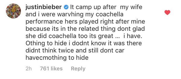 這個限時動態引起了一陣風波後,小賈也在他的個人Instagram帳號中澄清:「這段影片是前幾天在跟老婆看 Coachella 音樂節影片後出現的,這部影片就出現在他的表演影片後播放。」另外他也表示自己沒有什麽好隱藏的,所以才沒有三思就發出去的。他為了怕老婆海莉誤會,繼續表示網友不應該再繼續用個人的想像與推論來揣測,大家都是成人,不應該再玩這種遊戲。