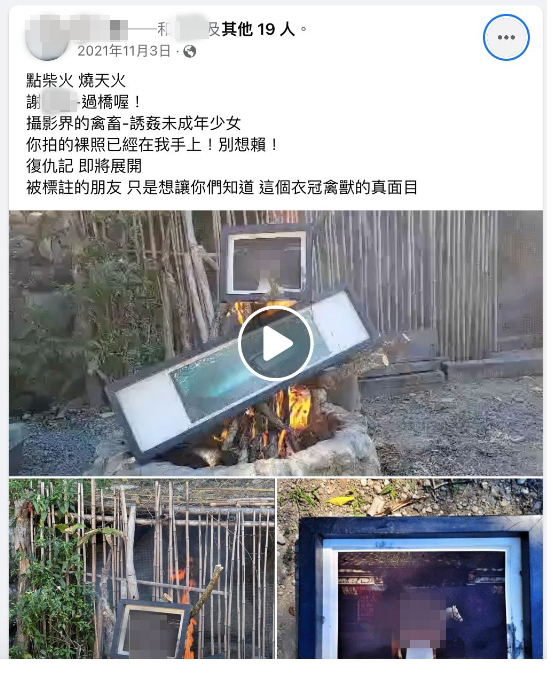 不过,这并非受害者母亲首次公开指责谢姓艺术家,她去年就在脸书PO出数张照片,从画面中可以看到,疑正在燃烧谢男的两幅作品,并砲轰「点柴火、烧天火,谢XX-过桥喔」、「摄影界的禽畜诱//奸未成年少女」、「你拍的裸//照已经在我手上!别想赖」、「复仇记即将展开」、「被标注的朋友,只是想让你们知道,这个衣冠禽兽的真面目」。