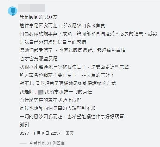 正當外界霧裡看花,一名自稱是焦圓圓男友的網友現身回應並道歉,「因為我做的爛事與不成熟,讓阿部和圓圓遭受不必要的謾罵、詆毀,是我自己沒有處理好自己的感情,讓她們都受傷了」,證實是三角糾紛。不過阿部瑪利亞並未對事件做出回應,經紀人則表示「感謝關心,藝人交友及私下狀況,公司不會特別過問。謝謝你們的關注」。