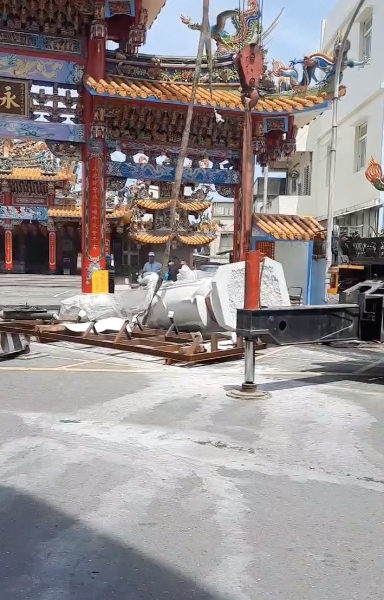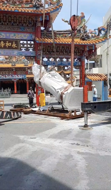 宜蘭羅東永和寺6月25日進行觀音大佛吊掛作業,過程中繩索斷裂,神像重重地砸至地面,觀音瞬間「斷頭」,一旁的工作人員紛紛嚇呆。
