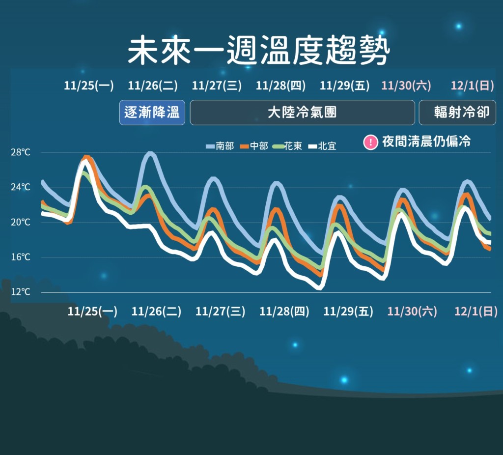 而一波大陸冷氣團將在明 (27) 日南下,屆時各地氣溫會顯著下降,氣象專家賈新興表示,這波冷空氣恐升級為強烈大陸冷氣團,預計最低溫會出現在周四 (28) 深夜至周五 (29) 清晨、周五 (29) 深夜至周六 (30) 清晨,再加上輻射冷卻影響,台北觀測站有機會出現12度以下低溫,花東縱谷也可能接近10度,苗栗以北空曠地區低溫甚至恐下探8度。