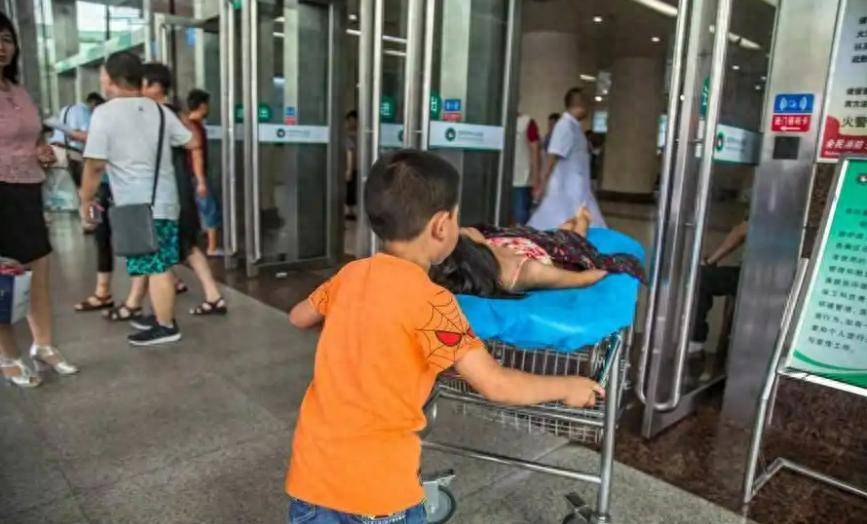 中国河南省信阳市一名叫做赵文安的7岁小男孩,在炙热的阳光下,推著担架来到乡村医院的门口,不少人纷纷投来好奇的眼光,原来上方躺着一位年仅11岁的女生,两人都是小孩,怎么身旁都没有大人呢?