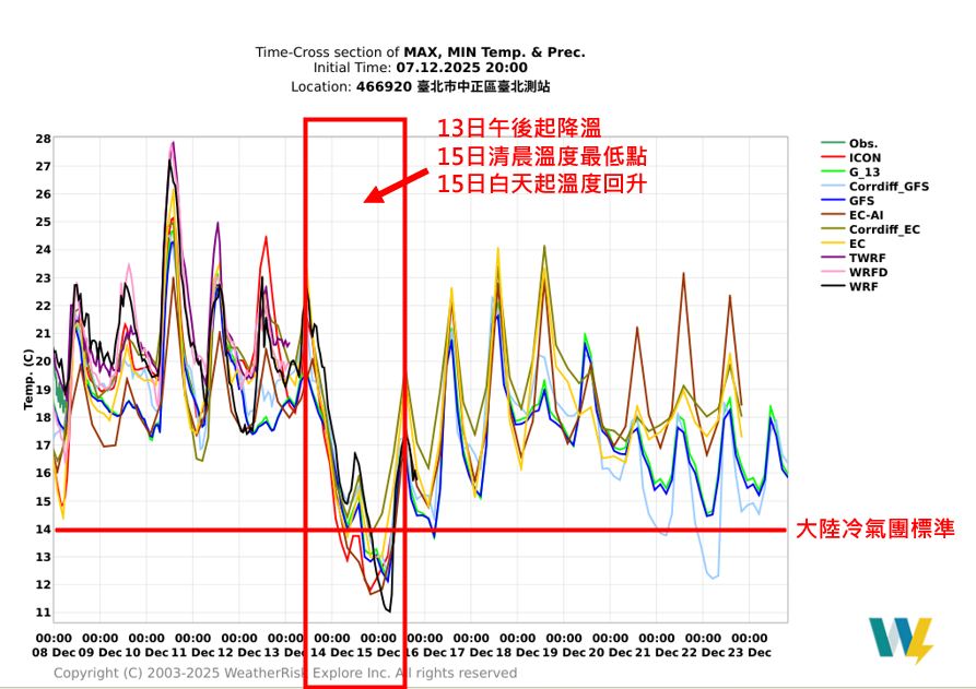 週日 (14) 夜晚到下週一 (15) 清晨溫度最低,吳聖宇說明:「中北部、東北部都市地區低溫僅14~16度,空曠地區有機會降到10~13度低溫,輻射冷卻明顯的地方可能會更低一點,有機會達到大陸冷氣團門檻,南部及花東都市地區低溫16~18度,空曠地區低溫也會降到13~15度或更低,這個溫度有較明顯的寒意,要多加注意。」