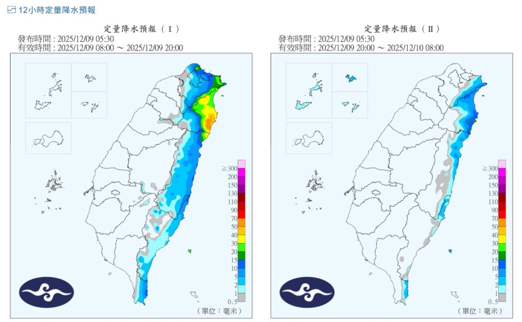 北部雨勢較大之外,其他各縣市也要注意東北風偏強。氣象署指出,今晨到明天上午 (9、10) 蘭嶼、綠島、新北市、桃園市、新竹市、新竹縣、苗栗縣、台中市、彰化縣、雲林縣、嘉義縣、屏東縣、澎湖縣、連江縣局部地區有平均風6級以上或陣風8級以上發生的機率。