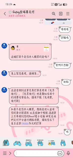 原PO相当疑惑,便私讯「Gopay」的客服,对方谎称,买家的身分讯息、金融卡帐号遭盗用,导致多出这笔上万元的订单。