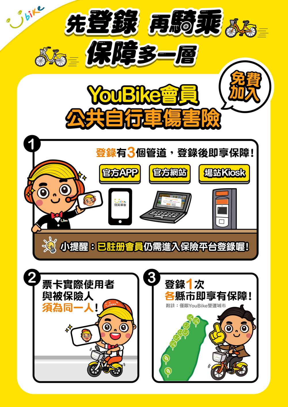 北市交通局強調,公共自行車傷害險完全免費,保費由政府全額負擔,投保目的在於民眾騎車出意外時,若造成死亡、失能及住院等情形,可憑醫療單據等文件向保險公司申請理賠,最高理賠金額達100萬元 (未滿15足歲者依規定)。另外值得注意的是,傷害險屬於人身保險,須採實名制登錄,民眾記得投保時登錄資料與實際騎乘者須為同一人,以確保理賠權益。