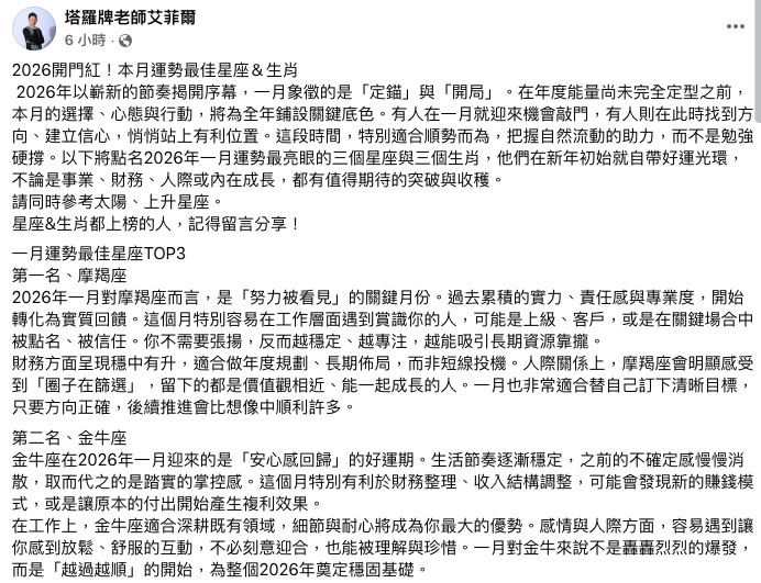 塔羅牌老師艾菲爾在臉書表示,2026年以嶄新的節奏揭開序幕,一月象徵的是「定錨」與「開局」,在年度能量尚未完全定型之前,本月的選擇、心態與行動,將為全年鋪設關鍵底色,有人在一月就迎來機會敲門,有人在此時找到方向、建立信心,悄悄站上有利位置,這段時間,特別適合順勢而為,把握自然流動的助力,不是勉強硬撐。