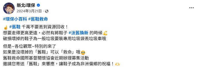 根据媒体《东森新闻》、《三立新闻网》的报导,新北市环保局曾在脸书粉专提醒,破损、坏掉或不堪使用的鞋子,在废弃物分类中属于「一般垃圾」,不应丢至资源回收,必须使用专用垃圾袋打包后交由循线垃圾车清运。