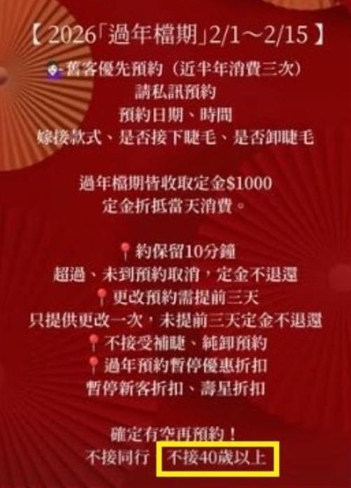 根據《東森新聞》、《民視新聞網》報導,該名網友分享的公告內容顯示,店家除標註「不接待超過40歲長輩、不接同行」外,還列出多項限制,包括:不開放攜伴、飲食,近3個月內曾整形者、趕時間或無法久躺者請勿預約,並提醒顧客嫁接睫毛前一天需先洗頭。