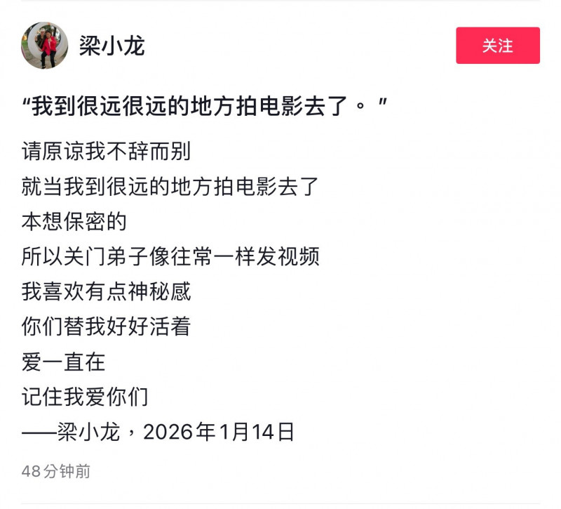 昨天 (18) 梁小龍的抖音帳號以第一人稱口吻,留給粉絲最後一封信:「請原諒我不辭而別,就當我到很遠的地方拍電影去了,本想保密的,所以關門弟子像往常一樣發視頻,我喜歡有點神秘感,你們替我好好活著,愛一直在,記住我愛你們。」信末日期押上2026年1月14日。