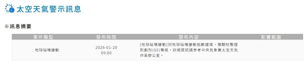 中央氣象署發布太空天氣警訊,指出今 (20) 日凌晨2點地球磁場擾動指數遽增,預期短暫達到劇烈 (G5) 等級,影響時間將長達36小時,屆時電力及通訊系統可能出現異常。