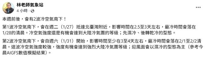 氣象專家林得恩也在臉書粉專「林老師氣象站」指出,周四 (29)、周五 (30) 短暫回暖後,周六 (31) 又會有一股冷空氣抵台,且影響時間長、強度較強,有機會達到強烈大陸冷氣團等級,影響時間至少3天,最冷時段預估會落在2/1至2/2清晨。降雨方面迎風面仍以濕冷型態為主。