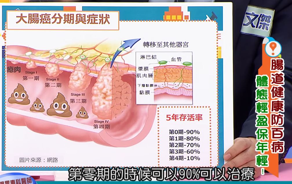 吳醫師曾說明,常外食、營養不均或攝取過多加工物可能導致腸道壞菌過多、菌相失衡,腸道長期發炎恐誘發息肉,最終演變成癌症。吳醫師指出,大腸癌第0期五年存活率高達90%,但到了第四期只剩10%。根據衛福部國健署,政府有補助45至未滿75歲民眾、40~44歲具家族史民眾,每2年1次糞便潛血檢查,呼籲早期篩檢、早期治療。