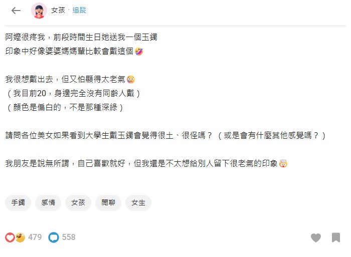 一位20歲女卡友認為婆婆媽媽較常戴玉鐲,不過阿嬤送了她一個偏白的玉鐲當生日禮物,「我很想戴出去,但又怕顯得太老氣」,好奇大家若看到大學生戴鐲會不會很土,「不太想給別人留下很老氣的印象」。一派網友分析要看款式顏色:「圓鐲比較年輕,我就是圓鐲,扁平的那種比較適合有點年紀的人」、「我覺得要看顏色欸,我覺得只有深綠色的才顯老,紫、粉、白、淡綠色都還好」、「自己戴著喜歡就行,至於老氣要看鐲型跟手圍稱不稱自己」。