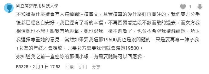 鹹酥雞分手文引來疑似當事男友回應,男主角先表示發票有中700元,可以先還500元,剩下的19,500元再議。吃瓜網友們因此從去年11月底線上追債,直到今年2月,男主角再次留言表示已展開新戀情、各自安好:「當然如果要我還那19,500我也是沒問題的,只是要再等一陣子我+ (現任) 女友的年終才會發放,只要女方 (前任原PO) 需要我們就會還她19,500。」男方解釋現任女友不願他繼續跟前任有瓜葛,所以決定資助他還款不再分期。