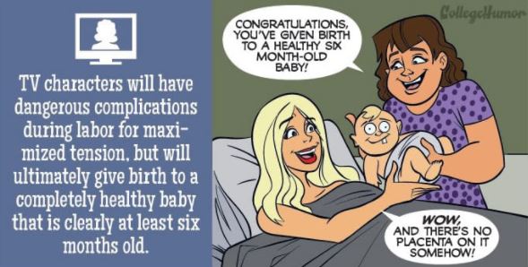 10. 电影或电视中的人物怀孕时会出现危及性命的并发症,将戏剧张力提升到极点,但最后会生出完全健康的宝宝,而且一出生就已经6个月大。