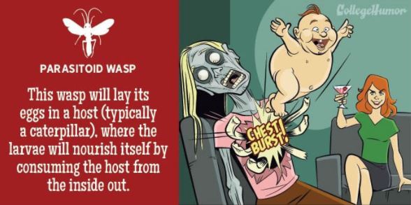 3. 寄生蜂会在宿主体内下蛋 (宿主通常是毛毛虫)。寄生蜂幼虫会在宿主体内成长,以宿主为食,最后破体而出。