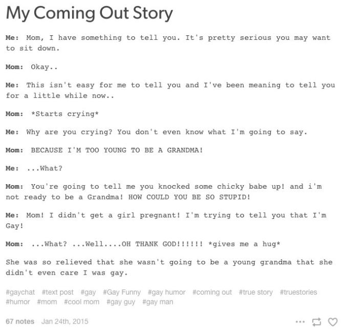 4. 我:「媽,我有事要告訴你。這事有點嚴肅,你最好坐下。」 媽:「好…」 我:「告訴你這事對我來說並不容易,我已經想告訴你很久了…」 媽:*開始啜泣* 我:「你哭啥?你根本不曉得我要說啥。」 媽:「因為我當奶奶還太年輕!」 我:「…蛤?」 媽:「你要告訴我你把某個妹的肚子搞大了!我還沒準備好要當奶奶!你怎麼那麼愚蠢!」 我:「媽!我沒讓女生懷孕好嗎!我是要告訴你我是gay!」 媽:「…蛤?…呃…感謝老天爺!!!*抱住我*」