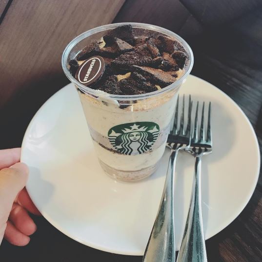 沒錯,平常星巴克裝咖啡的透明包裝杯,這一次被拿來裝巧克力脆片蛋糕!