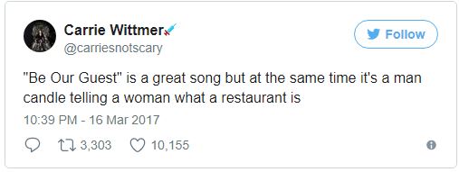 3.「〈Be Our Guest〉是首好歌,但它同時也是一個蠟燭人在告訴一個女人餐廳的定義」