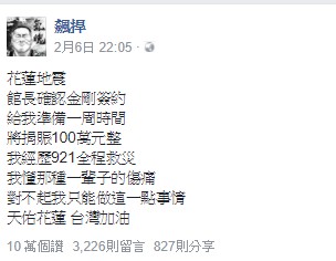 花蓮6日強震震誇多數高樓,災情慘重,不少人有錢出錢有力出力,期盼全台民眾能一起共體時艱,館長也為此捐出100萬元賑災,坦言921大地震參加過救災,能體會那一輩子的傷痛,「對不起我只能做這一點事情」,不過事後陳沂分享婦聯會捐款4200萬元震災文章,直言「婦聯會捐了4200萬,你捐了多少?你今天買贖罪券了嗎?」讓網友回應「館長也捐了100萬元」,卻沒想到陳沂回:「贖罪券買好買滿」。