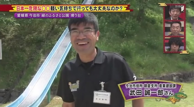 據了解,愛媛縣今治市「朝倉綠のふるさと公園」的溜滑梯,號稱是日本最危險的溜滑梯,不僅電視台採訪過,許多民眾也特意去朝聖,因溜滑梯全長70公尺、斜度27度,只要在不減速的情況下全力往下滑,到最後一定會飛出末端落地墊約10公尺。