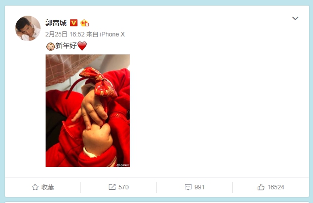 香港樂壇「四大天王」郭富城2017年升格為人父之後,非常保護妻女,女兒Chantelle的樣子一直都沒有在媒體前曝光過。可是日前他們一家三口出去拜年時,卻意外被記者拍到女兒萌萌的長相! 翻攝郭富城微博   郭富城和方媛在2017年結婚,並在同年9月產下女兒Chantelle。郭富
