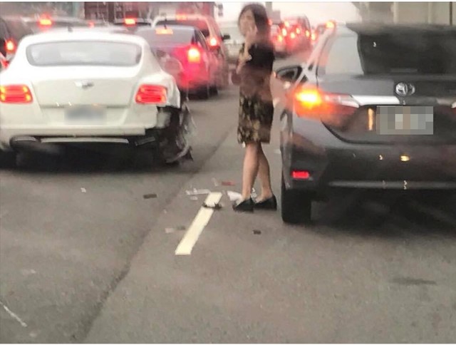 網友拍下車禍的照片在「爆廢公社」發文,可見一輛白色賓利在左前方,車屁股側邊整個被撞毀,一旁還有散落一地的零件,後方Toyota駕駛則是緊張地下車打電話,趕緊找人求救。