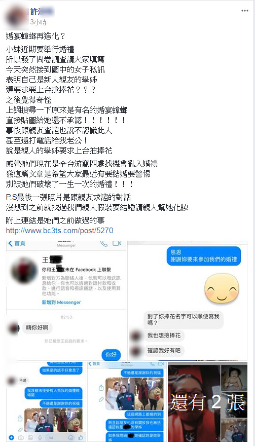 許姓女網友在「爆料公社」上傳幾張與婚宴蟑螂的對話截圖,王姓女子私訊她妹妹(準新娘),稱自己是某人以前的學姊,「你捧花名字可以順便寫我嗎?我也想撿捧花」,讓網友覺得莫名其妙,許女便找出先前網友在「爆料公社」上關於婚宴上白吃白樂的圖文,當中的人很像那位要求捧花的女子,截圖問王女本人,「請問這是你們嗎?」王女堅定回覆,「不是」。