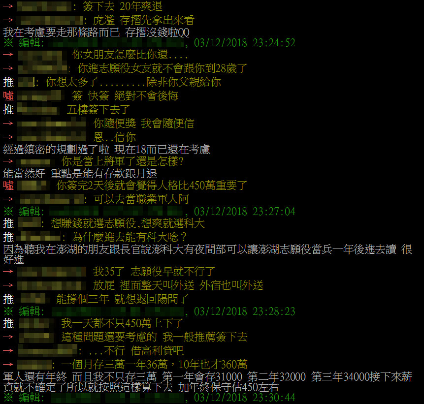 网友们看完后留言表示,「你去澎湖,你女友差不多两年后就怀孕跟同事前辈结婚」、「你会相信这种鬼话还是签下去好了,这脑袋在市场上只值22k」、「只能说里面龙蛇混杂的,你想保持自我真的很难」、「你进志愿役女友就不会跟你到28岁了」、「志愿役士兵,里面累积就算十年,拿出来还是很难用,深思」。