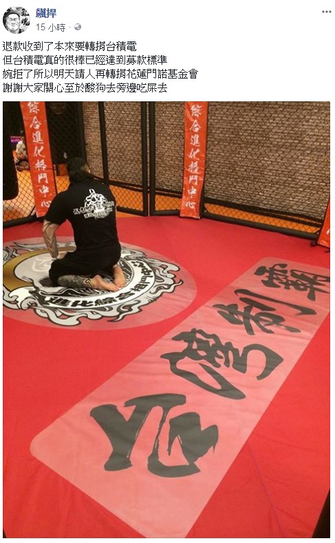 館長21日晚間在臉書上表示,原先打算要將退款捐給台積電,但是台積電已經達到了募款標準,因此婉拒了他的捐款,「所以明天請人再轉捐花蓮門諾基金會」,換個管道捐贈給受災戶,一心只想要幫助花蓮人,最後也說「謝謝大家關心,至於酸狗去旁邊吃屎去。」