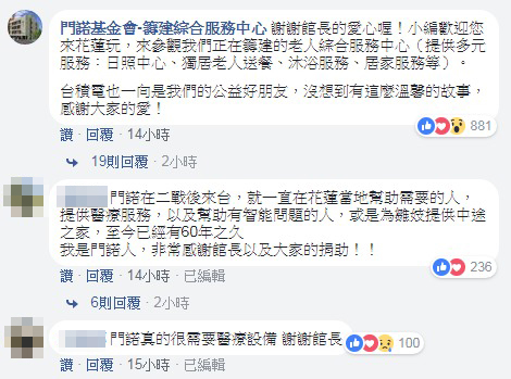 得知館長的愛心後,「門諾基金會-籌建綜合服務中心」的小編也現身留言,感謝館長的愛心,也歡迎館長到花蓮參觀他們正在籌建的老人綜合服務中心,並表示「台積電也一向是我們的公益好朋友,沒想到有這麼溫馨的故事,感謝大家的愛!」