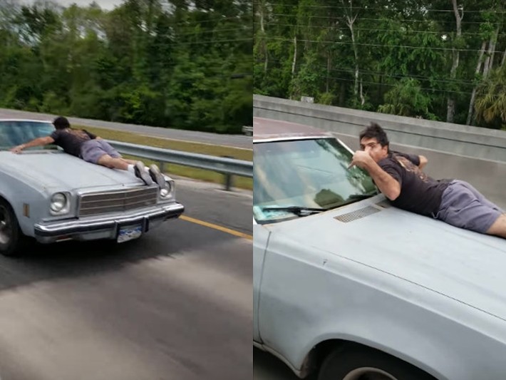 美國佛羅里達州10日一名卡車司機看後視鏡時,發現了很不對勁的畫面!卡車司機當時正在公路上,結果看到一名男子趴在一台雪弗蘭轎車的引擎蓋上,畫面超級驚險!