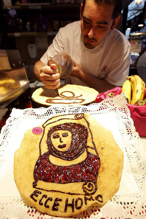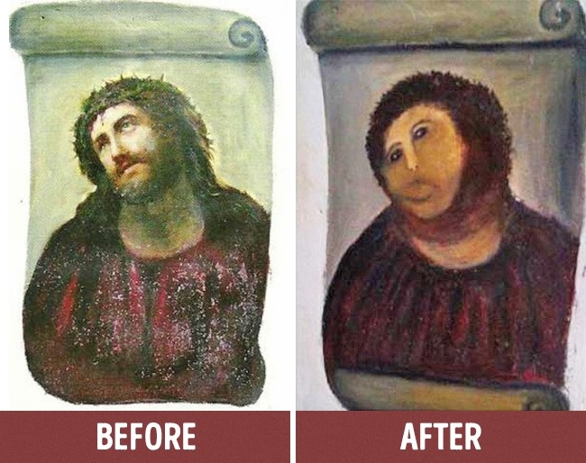 大家還記得西班牙發生過一次很悲劇的文物災難嗎?這是120年前畫家馬汀涅茲 (Elías García Martínez) 的作品《戴荊冠耶穌》,2012年80歲老奶奶Cecilia Giménez在沒有得到同意的情況下,自行「修復」該作品,結果就: