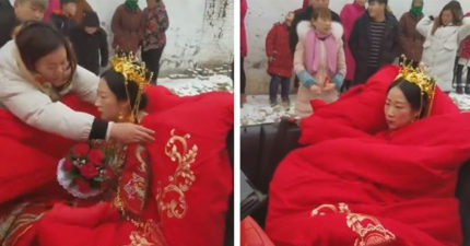 新娘戴金冠「大紅被裹緊緊」坐敞篷車 厭世表情卻讓網超心疼:完全不意外
