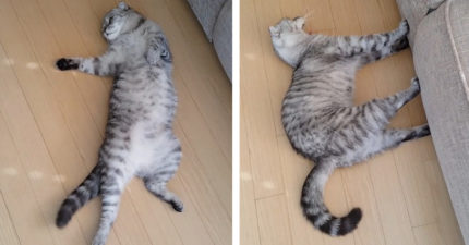 小灰貓躺地僵硬不動 主人戳牠直接翻身:朕乏了,你能不能別吵!