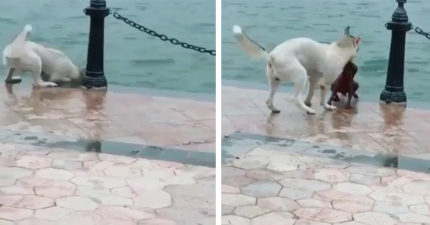 友誼萬歲!小白狗驚覺好麻吉落水 立馬伸頭叼住:別怕,我拉你一把~