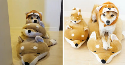 趴趴狗4尼!主人開門見柴柴 牠戴帽子趴布偶賣萌:有點心吃嗎~