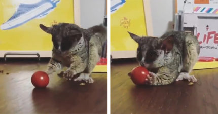 番茄混球堆滾過去 鼠狐猴接住一聞:啊娘喂~是食物!