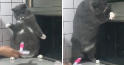 胖猫抵抗梳毛当「角落生物」 肥肚左晃右甩:朕不给的你不能要!