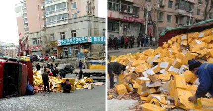 過彎側翻7萬瓶飲料全撒!路人一看狂撿裝箱…但結局卻讓司機哭了