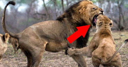 獅子叔叔企圖誘拐小獅被媽媽撞見,當場衝上去爆打到公獅「雄風」嚴重毀損!