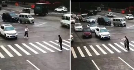 他拄著枴杖「奮力穿越大馬路」卻沒有車願意禮讓,女駕駛霸氣下車「我揹你」讓後方所有車都靜止了!(影片)