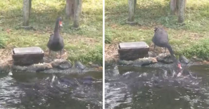 影/佛系黑天鵝抓乾糧「低頭餵鯉魚」 慈母眼神5秒:快吃吧孩子