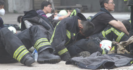 桃園大火狂燒整晚 消防員「太陽升起時」累癱地上…面罩都無力拔
