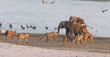 小象遭14隻獅子包圍快被吃掉 下秒「出奇招」上演逆轉