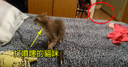 左邊這隻貓咪打完噴嚏後,紅色圈圈裡最爆笑的連鎖反應就發生了!