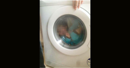 這名21歲的年輕媽媽開心的上傳了這張唐氏症兒子在洗衣機中的照片。